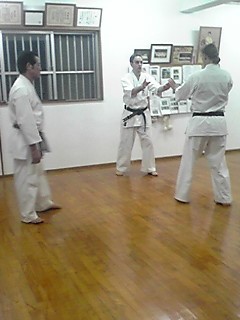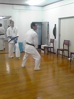 11月4日、石川道場に滞在するドイツ支部・トーマス指導員、マルクス会員は、奥浜先生から自由組手及び約束組手の指導を受けました。