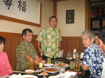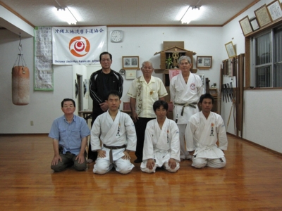 (高良信徳首席師範、松田先生、奥浜真三郎先生、玉代勢先生、喜納先生、宮崎先生、普天間道場の皆さんと) |