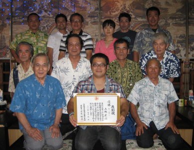 普天間道場では、第14回首都圏大会・有段者型の部で見事優勝した上地武徳会員の祝賀会を開催しました。祝賀会には高良信徳首席師範や喜納会長など協会幹部が揃い、大会を振り返りながら皆でお祝いしました。